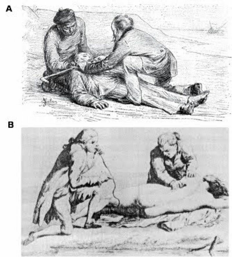The kit comprised a bellows – originallya pig’s bladder – a tobacco pipe, a mouthpiece, and a cone for insertion. The technique gained popularity in 1746, when a drowned woman was resuscitated courtesy of a rolled piece of paper and a sailor’s pipe; a success story that saw ‘The Institution for Affording Immediate Relief to Persons Apparently Dead from Drowning’ install the kits at various points along the Thames, and build a centre by the Serpentine in Hyde Park to rescue drowned skaters.